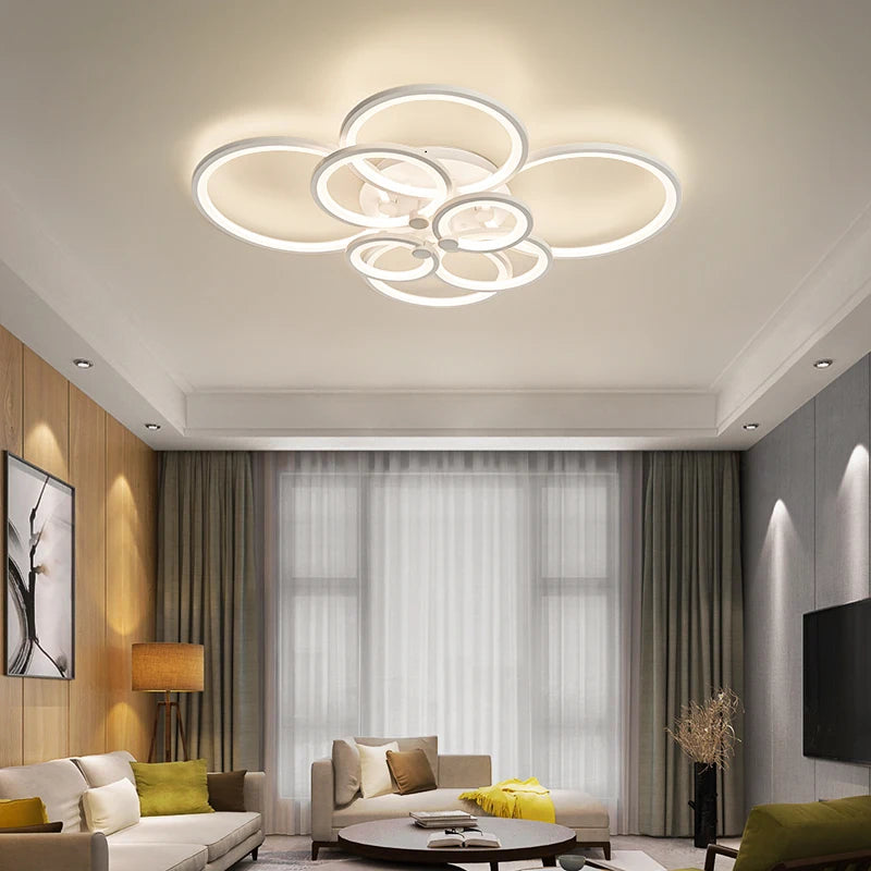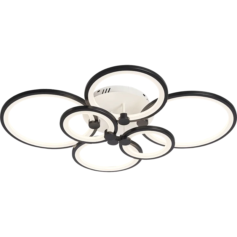 Le lustre à anneaux circulaires se distingue par son design épuré et moderne. Composé de plusieurs anneaux en fer, il crée un effet visuel captivant qui attire l'œil. Sa finition en fer noir ajoute une touche industrielle, tandis que ses lignes fluides apportent une légèreté à l'ensemble. Grâce à sa structure semi-flush mount, ce luminaire est parfait pour les espaces avec des hauteurs de plafond variées. Que vous ayez un plafond bas ou haut, ce lustre saura s'adapter tout en préservant l'espace.